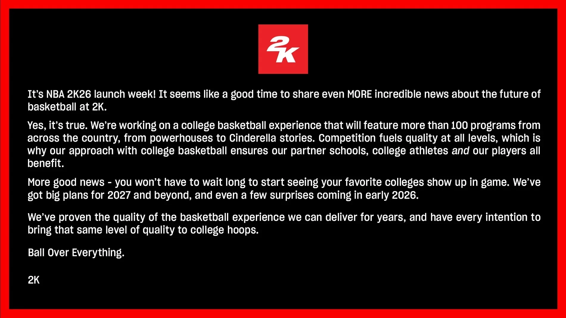 «Да, это правда. Мы работаем над игрой про студенческий баскетбол, которая будет включать более 100 программ, охватывающих всю страну — от самых известных команд до типичных „историй о Золушке“. Конкуренция стимулирует качество на всех уровнях, поэтому наш подход к студенческому баскетболу гарантирует выгоду партнёрским вузам, спортсменам и нашим игрокам».