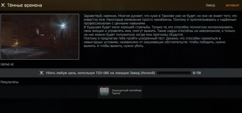 Теперь Скупщик предлагает уникальное задание «Тёмные времена». Нужно отправиться на фабрику в ночное время суток и уничтожить 30 любимых целей лишь с помощью дробовика ТОЗ-106. Среди игроков он считается одним из самых бесполезных видов оружия в шутере, однако с правильным подбором боеприпасов убийство 30 целей не станет серьёзной проблемой.