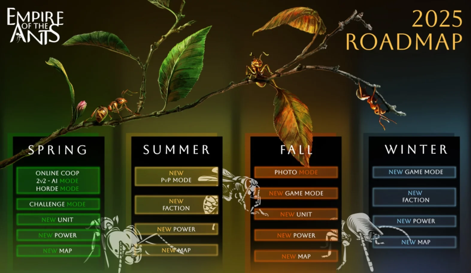 Осенью получится сделать снимки в фоторежиме — графику и красоту природы Empire of the Ants высоко оценили журналисты. Далее идёт стандартный набор: новинки появятся в стане юнитов, способностей и карт. В конце 2025 года, зимой, поклонников ждёт некий новый режим, а также фракция, способность и карта.