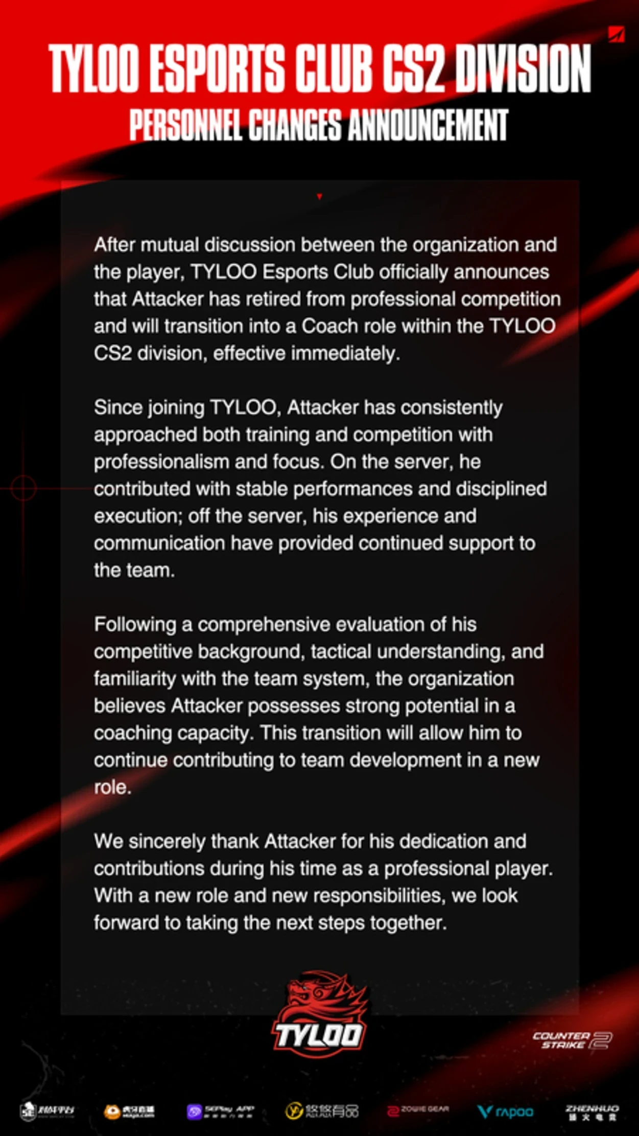 Ветеран китайской сцены Attacker завершил карьеру игрока в CS2 и стал тренером TYLOO