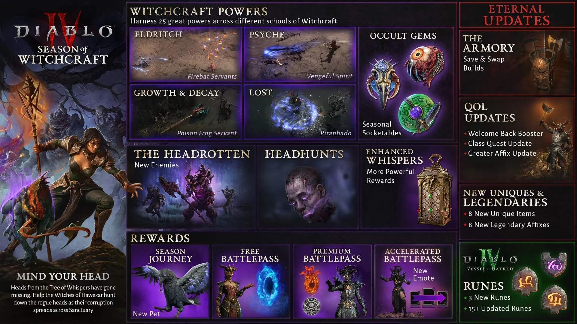 С новым сезоном в игре появятся некоторые улучшения: оружейная, позволяющая легко переключаться между избранными вариантами развития персонажа, новые и обновленные руны, система усиления героя в вечном мире и изменение классовых заданий. Ознакомиться с деталями обновлений можно на официальном сайте игры.