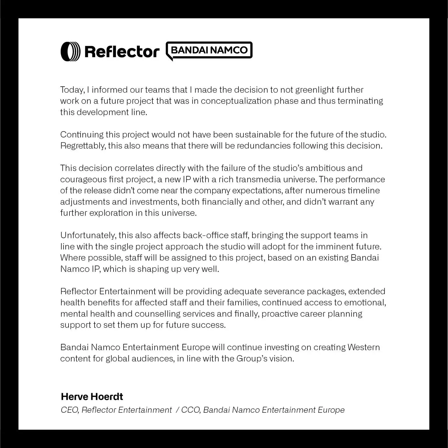 Остатки Reflector Entertainment подключатся к работе над игрой по некоей успешной франшизе Bandai Namco. Подробности, как и масштабы сокращений Хёрдт не сообщил.