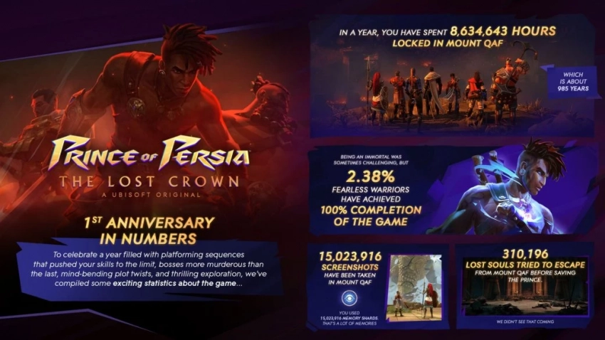 Ещё больше интересных видео на YouTube канале Игромании!Скриншот Prince of Persia The Lost CrownНа днях отметила свою первую годовщину приключенческая метроидвания Prince of Persia: The Lost Crown — релиз игры состоялся 18 января. Ubisoft уже отметила это событие специальным трейлером. А теперь компания опубликовала статистику за первый год игры.