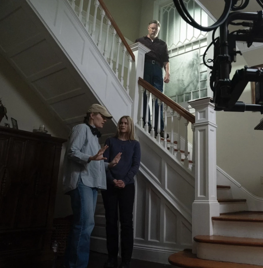 На кадре можно увидеть режиссёра картины Эмму Тамми («Обитель страха»), а ещё — Мэттью Лилларда («Крик») и Элизабет Лэйл («Ты»), которые вернулись к ролям Уильяма Афтона и Ванессы.