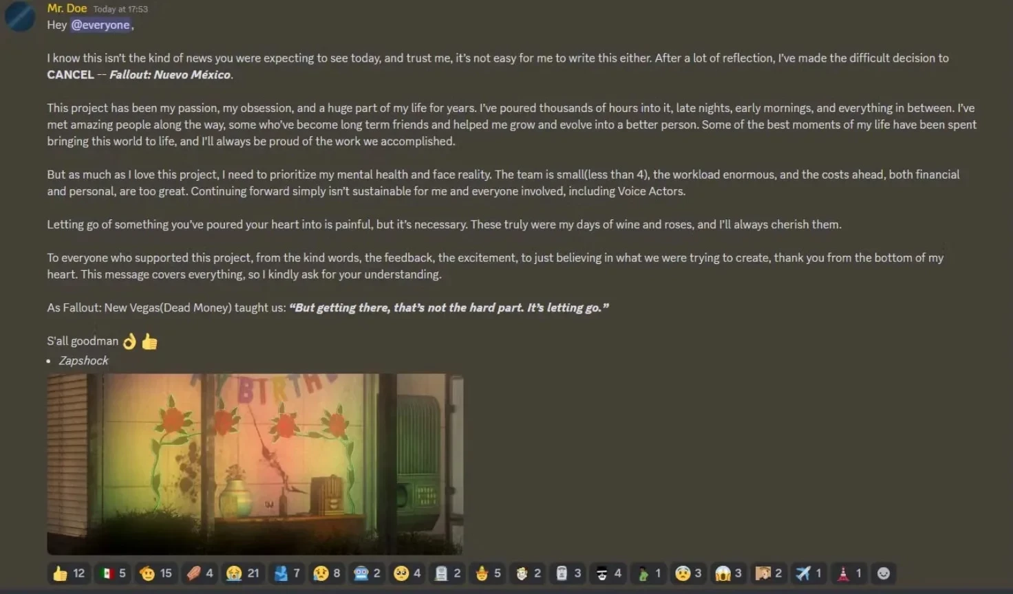 Всех неравнодушных Zapshock поблагодарил за поддержку. Также он вспомнил проницательную фразу из Fallout: New Vegas — сложнее всего не пройти путь до цели, а отпустить его.
