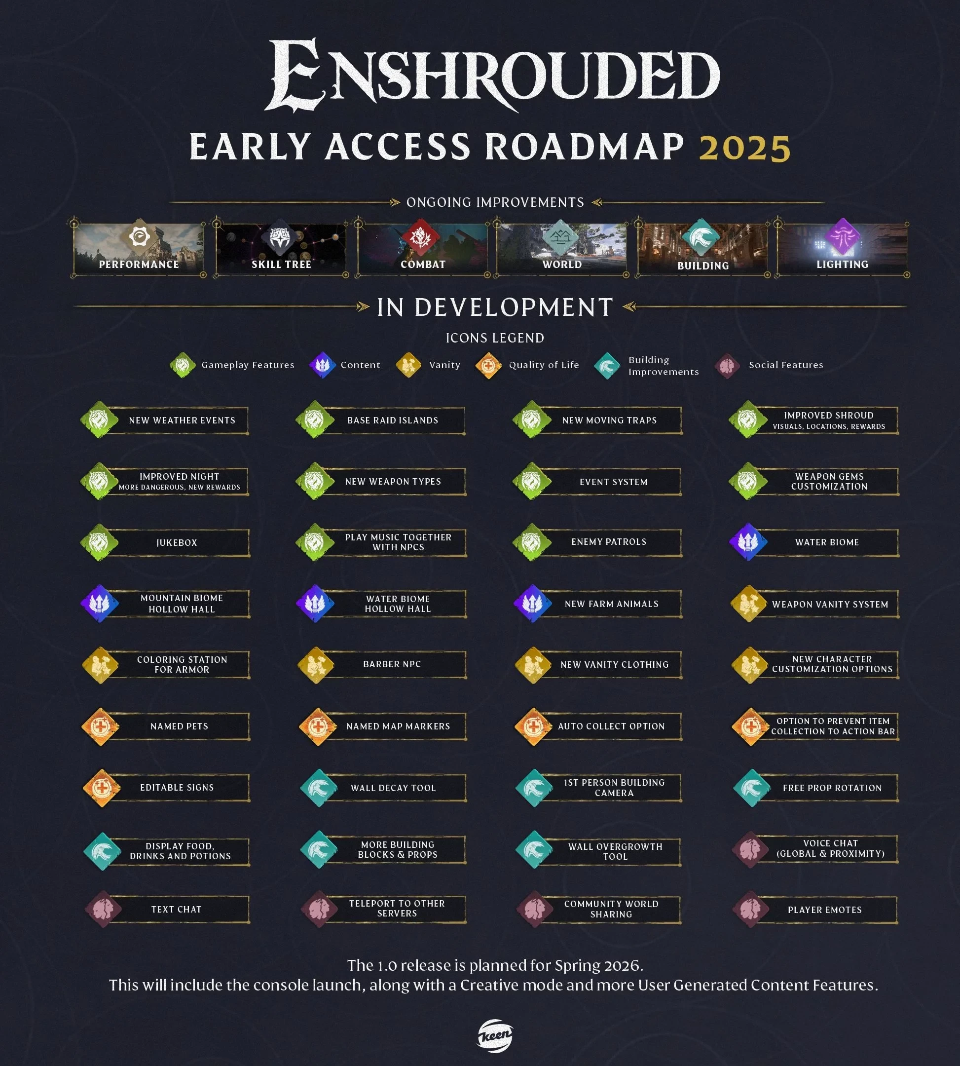Всего за год более трёх миллионов игроков отправились в приключения в Эмбервейле, получив пять обновлений контента, шесть патчей и 19 исправлений. Enshrouded сохраняет рейтинг «Очень положительный» в Steam с момента запуска в раннем доступе в январе 2024 года, и команда продолжает внимательно прислушиваться к отзывам игрокам, работая над версией 1.0 для РС и консолей, релиз которой ожидается весной 2026 года.