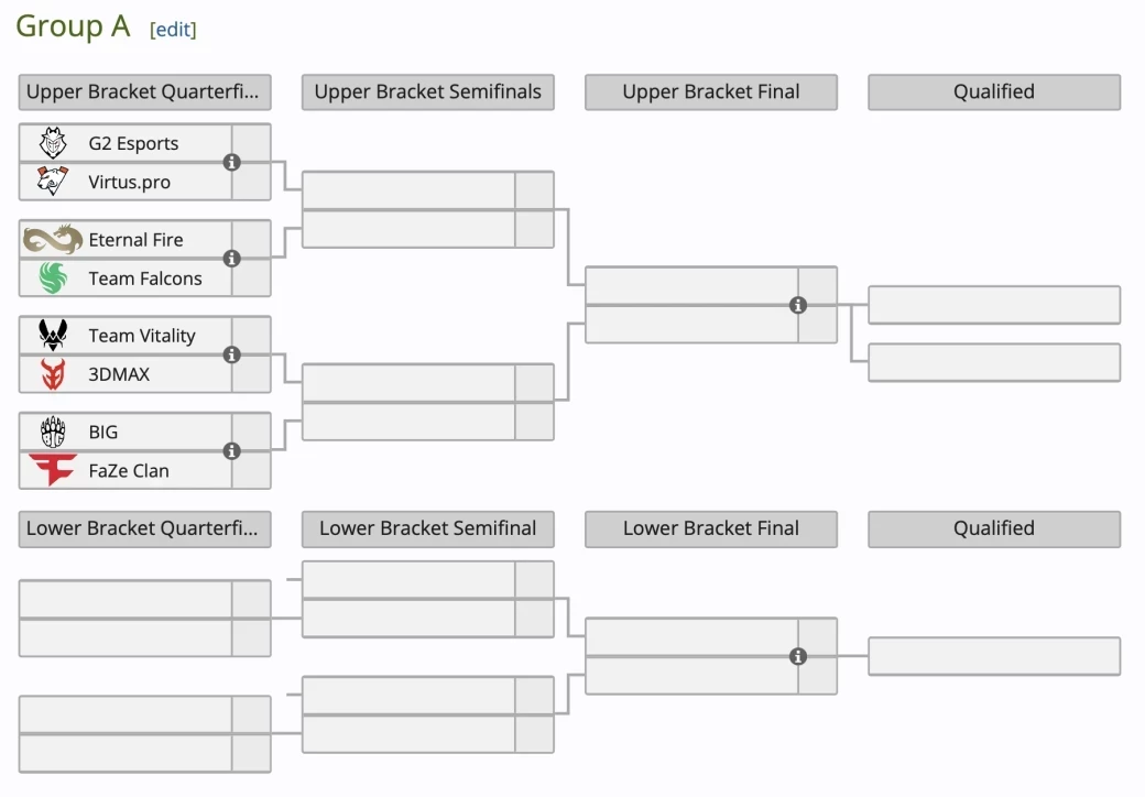 В группу А попали G2 Esports и Virtus.pro, Eternal Fire и Team Falcons, Team Vitality и 3DMAX, BIG и FaZe Clan.