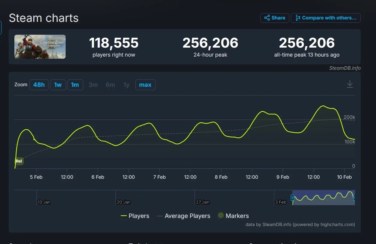 Cоздатель Kingdom Come: Deliverance 2 Дэниел Вавра не ожидает, что пиковый онлайн игры продолжит расти в ближайшие будние дни. Но, по его словам, было бы круто достичь 300 тыс игроков одновременно — «уровня Starfield».