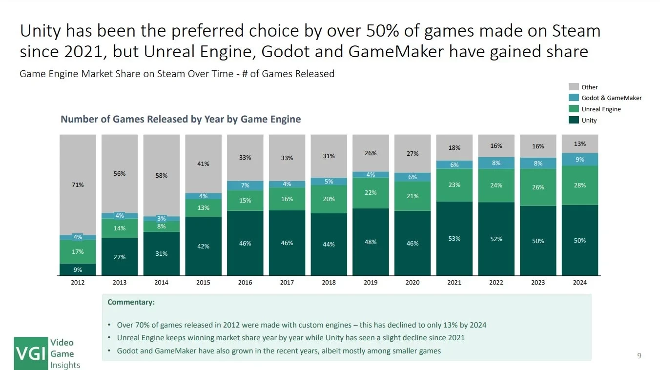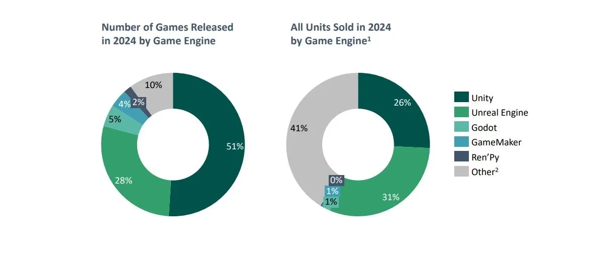 VGI подсчитала, что лишь 10% игр, вышедших в Steam в 2024 году, было создано на проприетарных движках, таких как Frostbite. На РС-рынке безоговорочно доминируют Unity (51%) и Unreal Engine (28%).