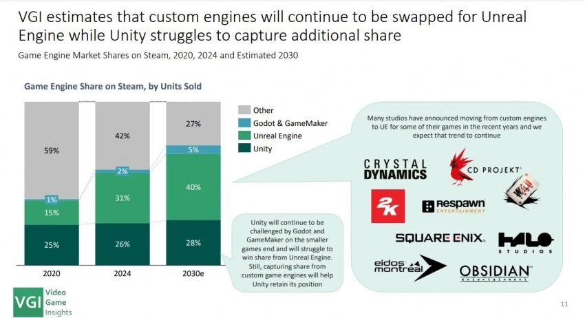 С одной стороны, движок Unreal Engine тоже набирает силу, вон даже разработчики The Witcher 4 перешли на его новейшую версию. В то же время графический движок Epic имеет свои недостатки и не пользуется хорошей репутацией среди геймеров. VGI, впрочем, предполагает, что в 2030 году проекты, созданные на Unreal Engine, будут составлять 40% всех игр, продаваемых в Steam.