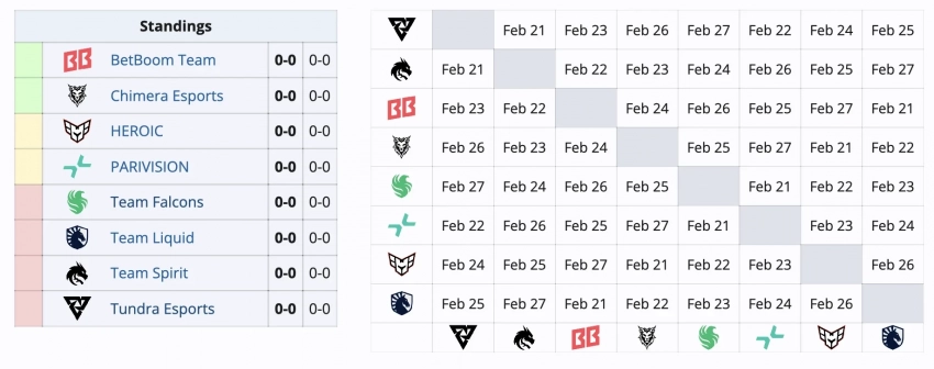 Команды начнут сражения уже 21 февраля и закончат 27-го. Затем станут известны четыре участника плей-офф. В первый день сыграют BB Team с Liquid, Falcons с PARIVISION, Tundra с Spirit, а Chimera с HEROIC.