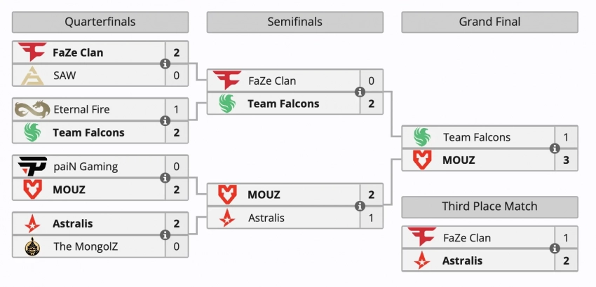 На четвертом месте расположилась FaZe Clan с призовыми в 87,5 тыс долларов. В турнире также участвовала и Virtus.pro, которая заняла 9-11 место и заработала 31,250 долларов.