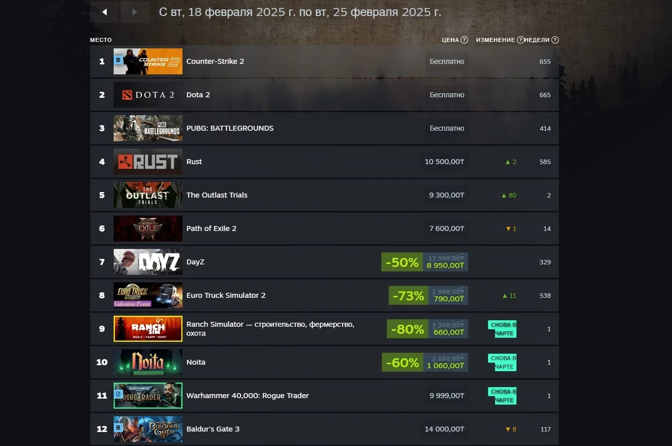 Если говорить про российский сегмент Steam, то изменений не так много — первые места удерживают условно-бесплатные игры. При этом сразу на 80 мест вперёд вырвался кооперативный хоррор The Outlast Trials. Увы, ролевой игре Warhammer 40,000: Rogue Trader совсем немного не хватило для того, чтобы войти в первую десятку.