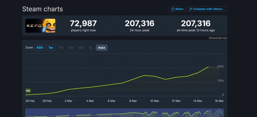 Так, рекорд R.E.P.O. составил более 207 тысяч человек на пике 15 марта. К этой цифре хоррор шёл планомерно, ведь 26 февраля в него играло не более восьми тысяч человек, а 2 марта произошёл первый серьёзный скачок — тогда в R.E.P.O. находилось 46 тысяч пользователей одновременно. Следующая крупная волна пришлась на 9 марта (145 тысяч геймеров), а 14 и 15 марта число игроков только продолжило расти.