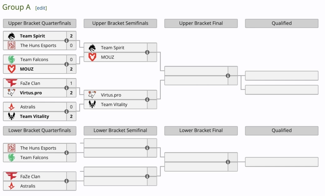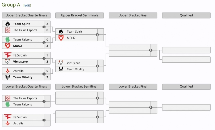 В первый день прошли четыре матча группы А. Побед добились Team Spirit и MOUZ, Virtus.pro и Team Vitality. Они сыграют за выход в финал верхней сетки.