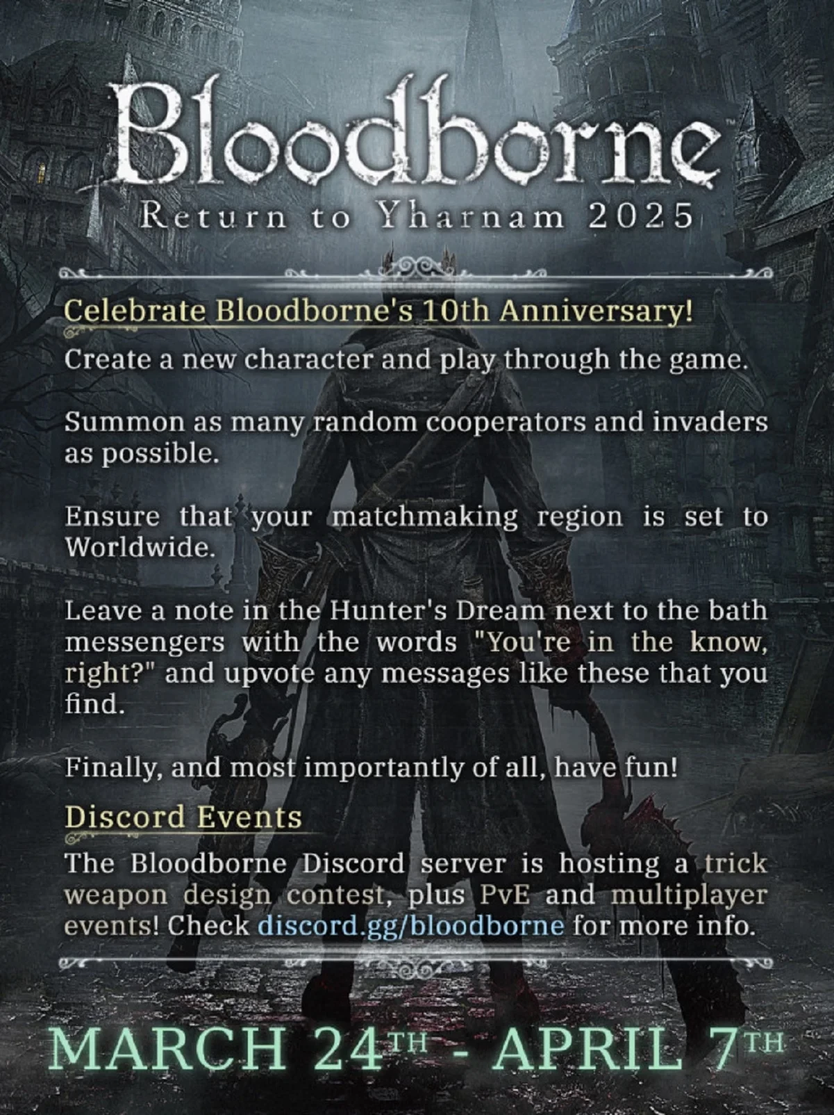 В этом году «Возвращение в Ярнам» проводится до 7 апреля. Геймеры удивляются тому, как быстро пролетели 10 лет, за которые Миядзаки успел выпустить Dark Souls 3, Sekiro: Shadows Die Twice и Elden Ring. Единственной проблемой события поклонники называют необходимость наличия подписки PS Plus для доступа к мультиплееру.