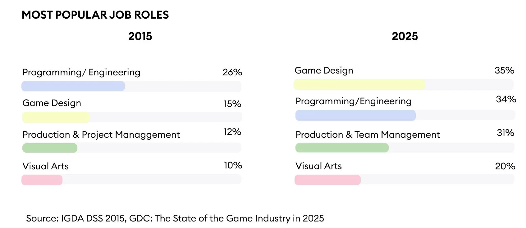 • На первое место по роду работы за десять лет выбился игровой дизайн: количество специалистов выросло с 15% до 35%.