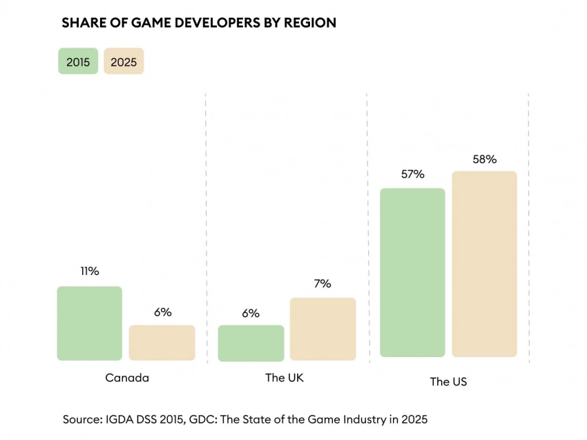 Второе место по насыщенности разработчиками занимала Канада, её доля в 2015 году составляла 11%. Однако к 2025 году её доля снизилась до 6%, и её опередила Великобритания.