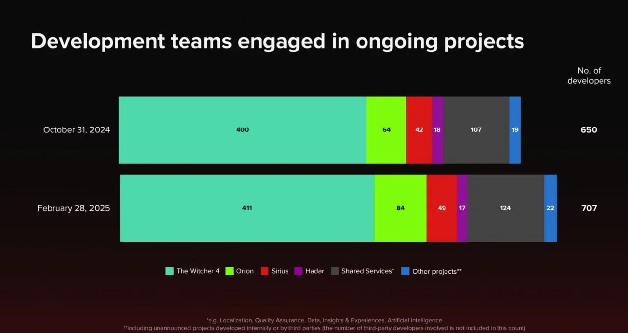Как мы помним, в ноябре 2004 года в CD Projekt работало 650 человек. Теперь это число выросло до 707. Самая большая команда трудится над новой частью «Ведьмака» — 411 сотрудников. К крупным проектам отнесены продолжение Cyberpunk 2077 под названием Project Orion (84 человека), The Witcher: Sirius (49 человек) и оригинальная Hadar (17 человек).