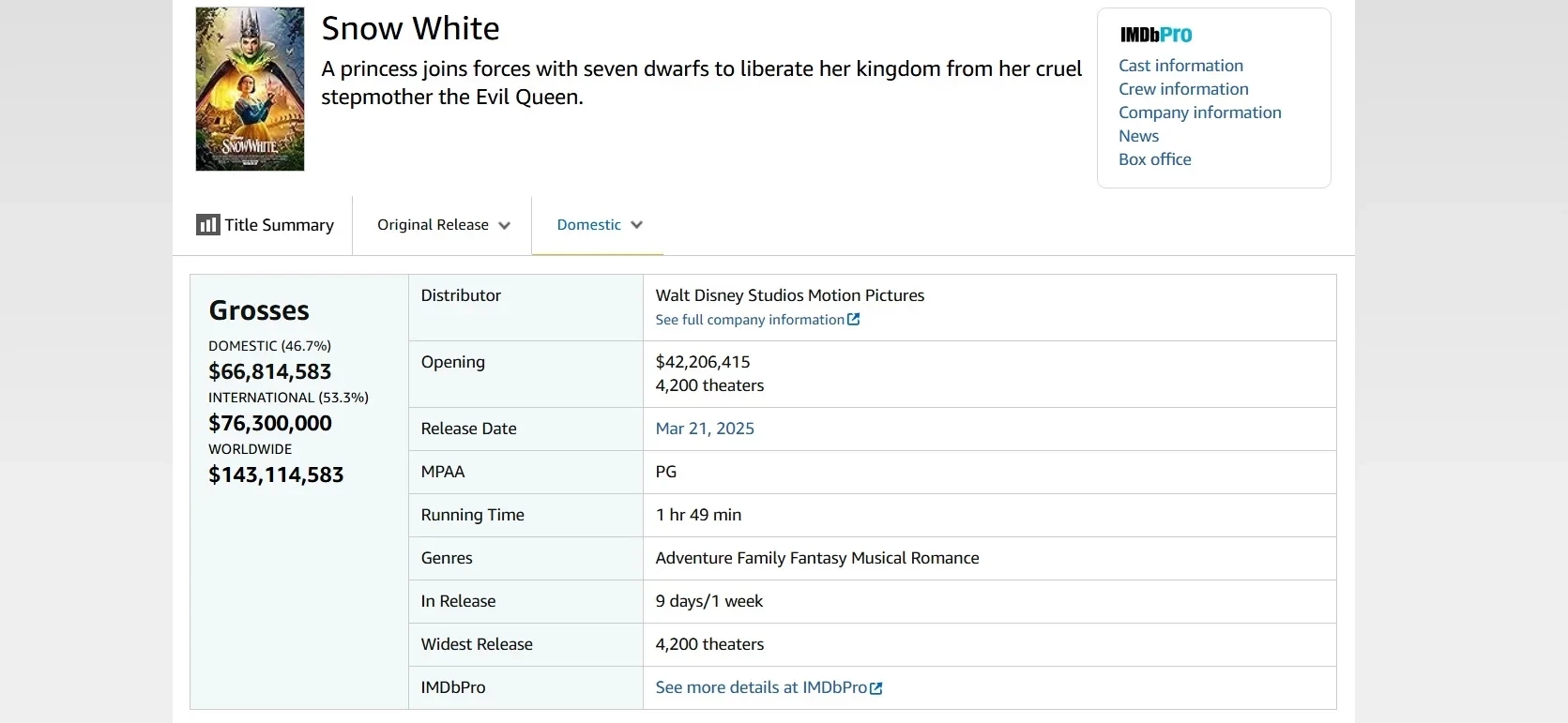 «Белоснежка» — 14,2 млн долларов в США (143,1 млн долларов в мире);