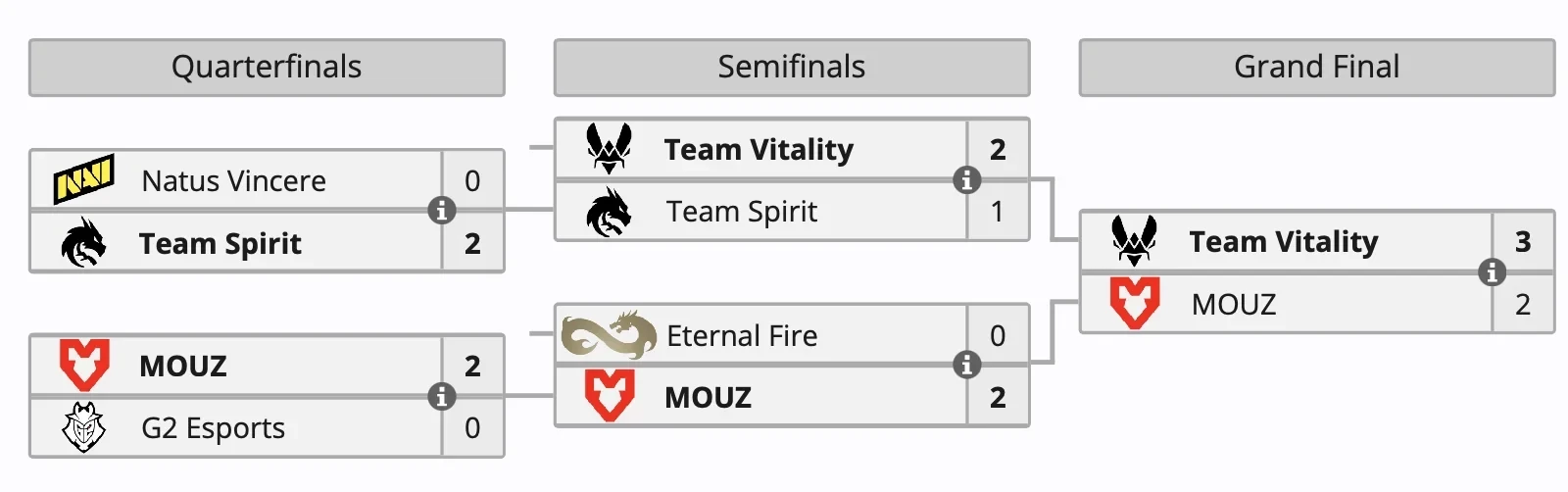 На пути к финалу Team Vitality заняла первое место в группе, не проиграв ни одной карты, а затем в полуфинале одолела Team Spirit в напряжённой серии со счётом 2:1. Финальная битва началась с разгромной победы Vitality на карте Inferno (13:0), но MOUZ сумели взять реванш на Mirage и Dust II, оба раза с результатом 13:11. Однако на картах Nuke и Train Team Vitality вновь показала своё превосходство, завершив серию победой 13:7.