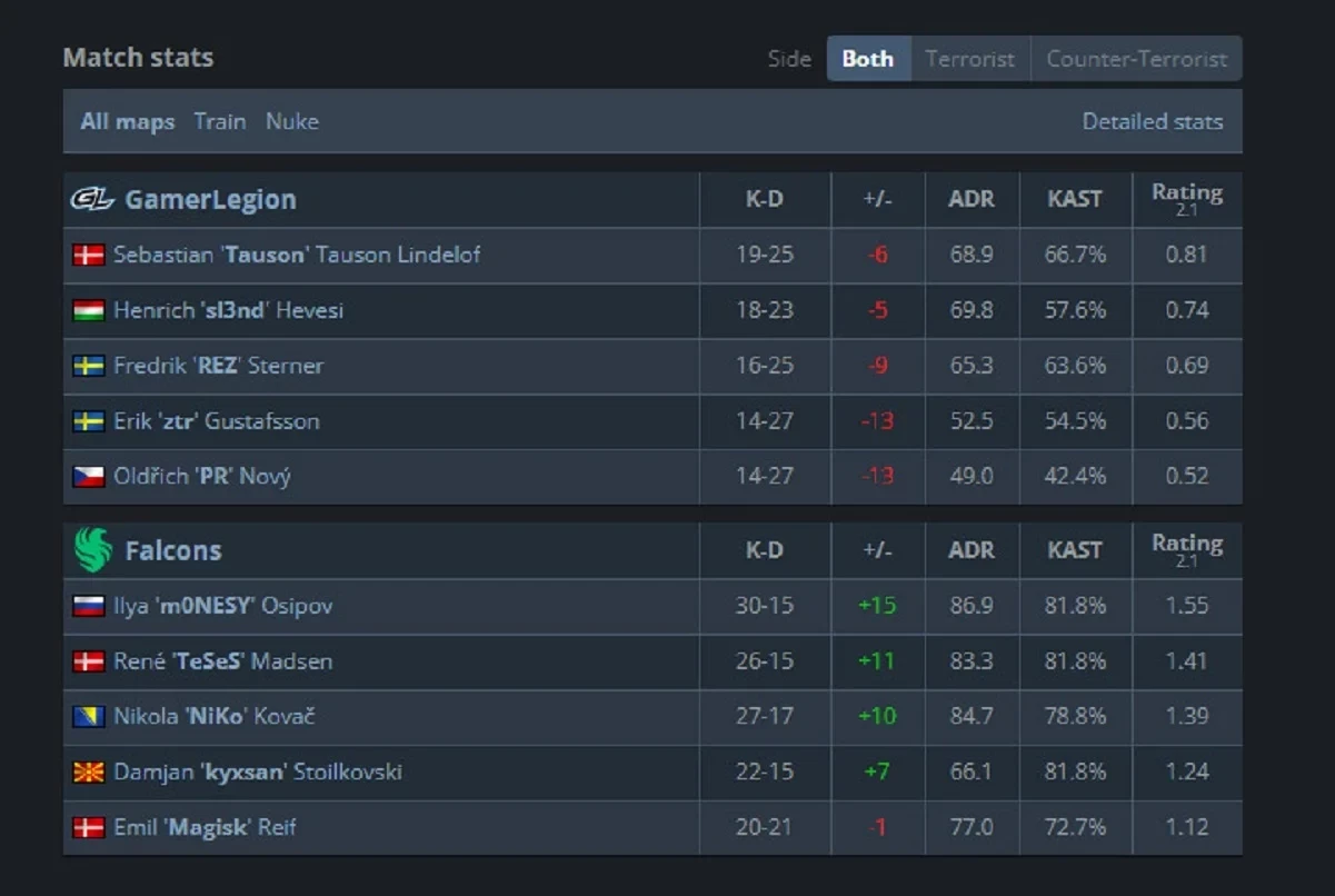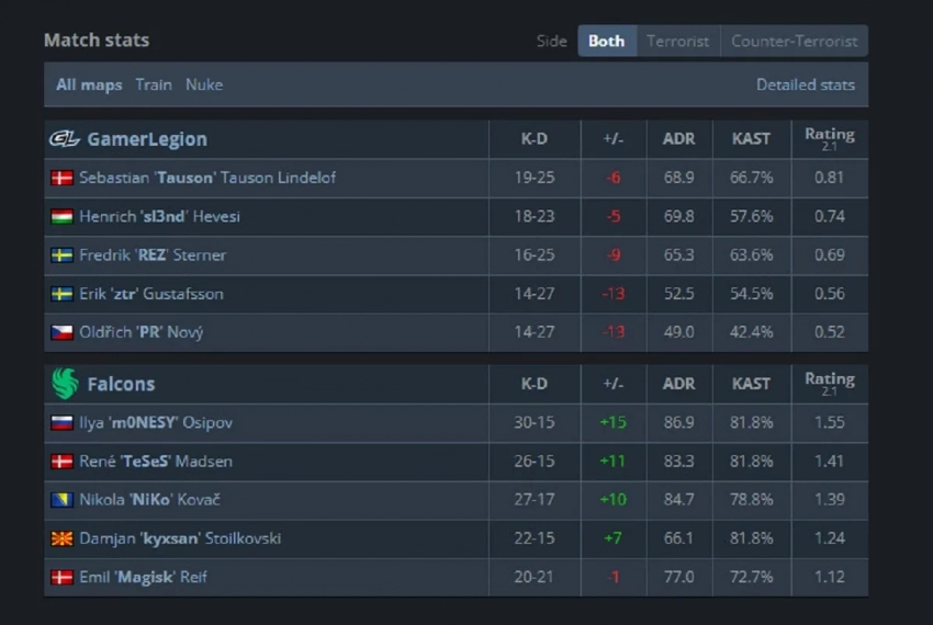 GamerLegion пикнула Train. Счёт составил 13:3 в пользу Falcons. А вот Nuke была уже пиком Falcons, где команда также уверенно сразила противников со счётом 13:4. Это позволило коллективу уверенно продвинуться по турнирной таблице — перед гранд-финалом остался единственный соперник.
