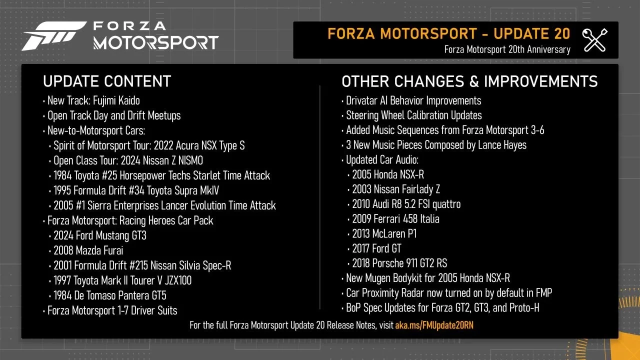 Ещё больше интересных видео на YouTube канале Игромании!Скриншот Forza MotorsportСтудия Turn 10 объявила о выходе двадцатого обновления к гоночному симулятору Forza Motorsport. Оно приурочено к двадцатилетию знаменитой серии, и разработчики приготовили для игроков массу нового.
