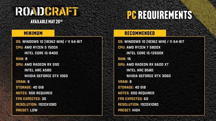 RoadCraft потребует 40 ГБ на SSD и как минимум 8 ГБ оперативной памяти, GeForce GTX 1060 или Radeon RX 580. Эта начинка позволит геймерам играть на минималках в 1080p при 30 FPS.