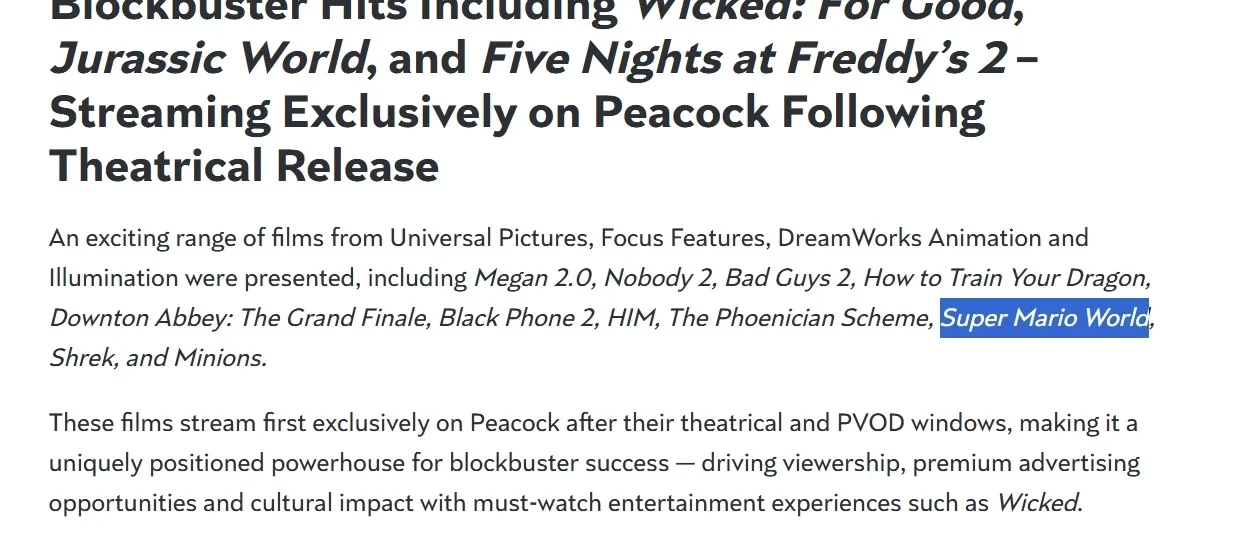 Самое интересное о кино на YouTube канале Игромании!Обложка: NintendoВ сети обсуждают название следующего мультфильма о Марио, которое упоминается на сайте NBCUniversal в списке грядущих премьер.