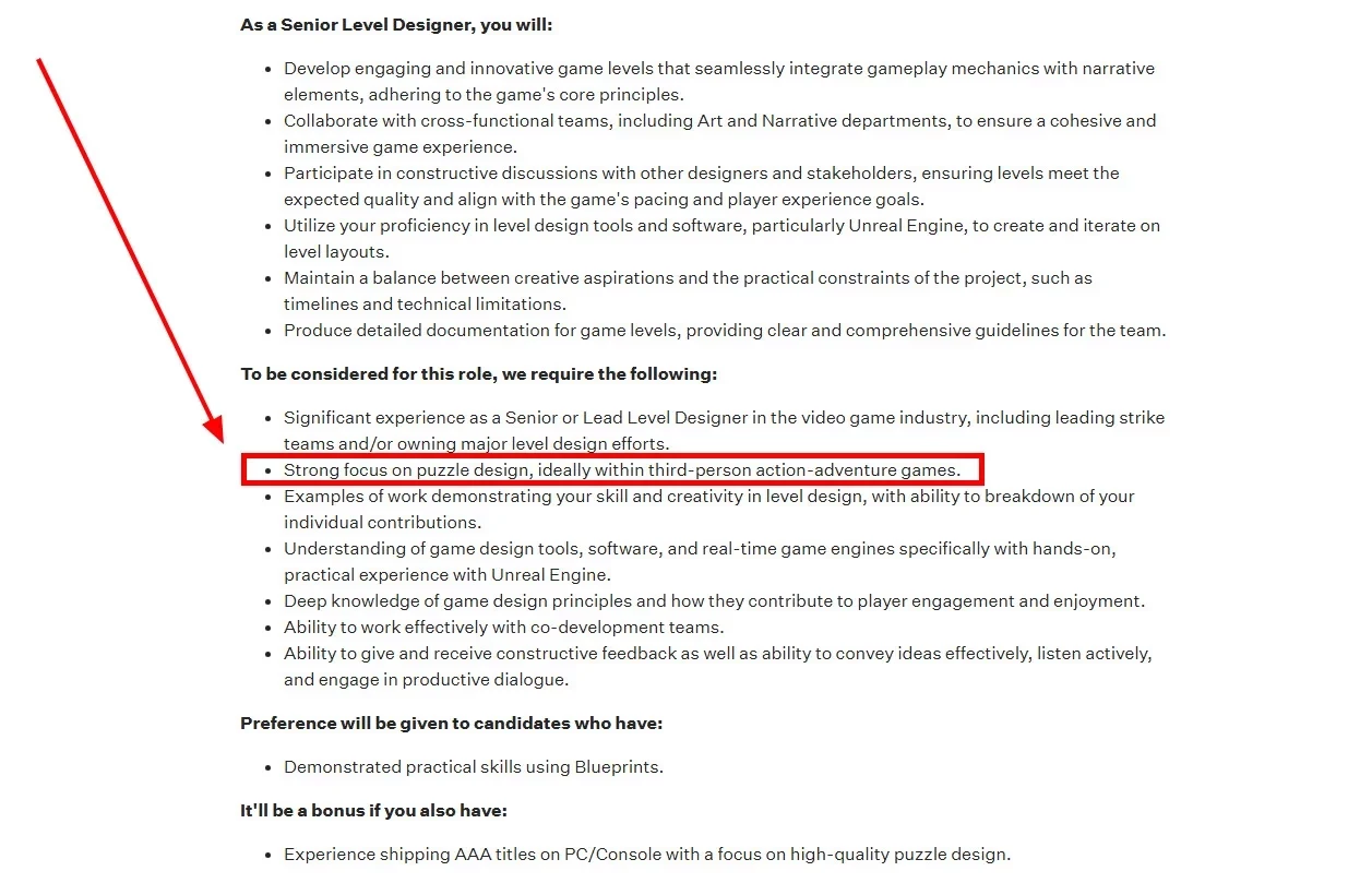 В описании вакансии есть важные уточнения, которые намекают на то, что дизайнер уровней будет трудиться над новой Tomb Raider (2025?). Соискателю в обязательном порядке требуется опыт работы над приключенческими играми от третьего лица с головоломками. Причём желательно, чтобы это были ААА-игры на консолях и PC. Все эти требования отлично подходят под описание очередных приключений Лары Крофт.