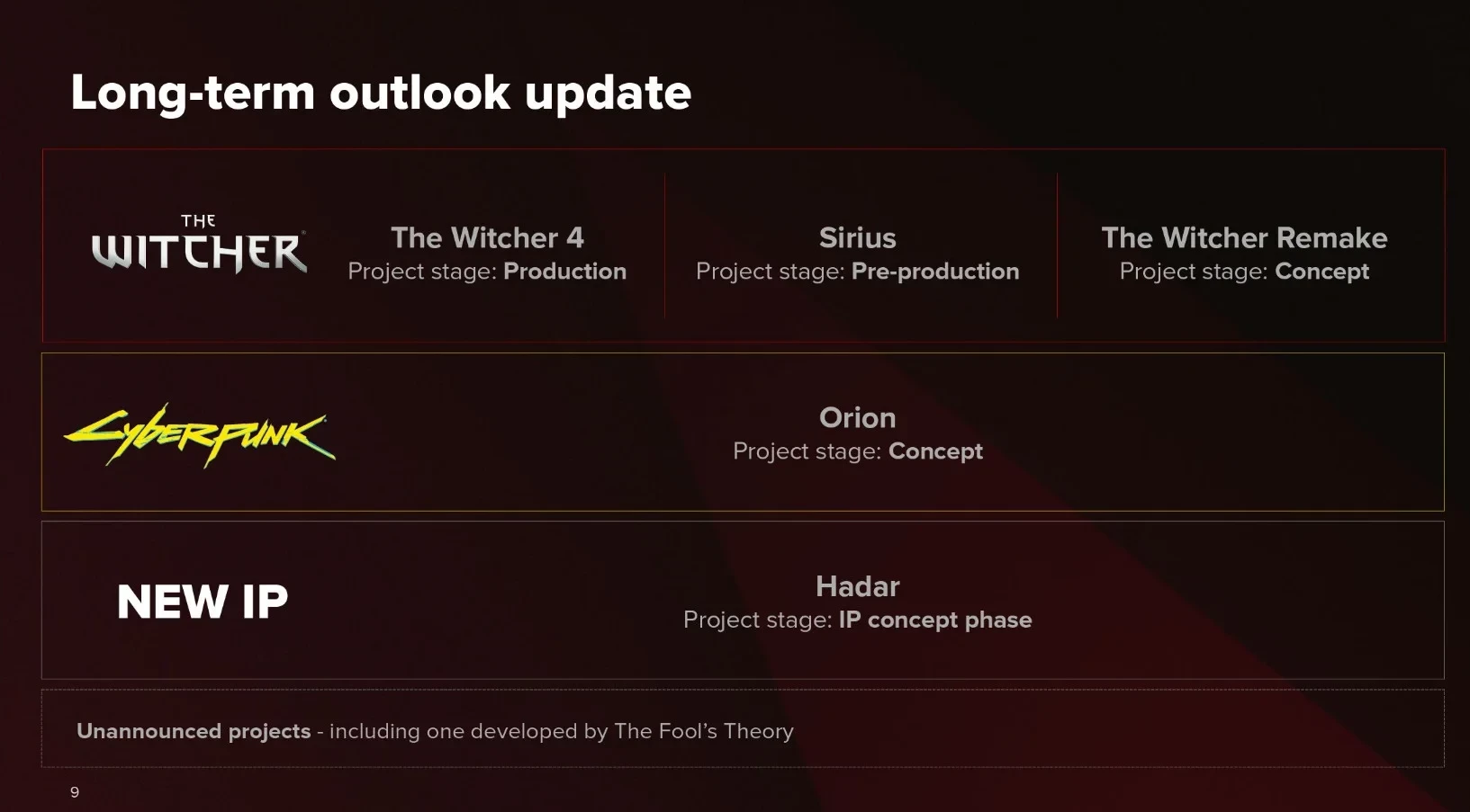 В финансовом отчёте наравне с франшизами The Witcher, Cyberpunk и Project Hadar стоят неанонсированные проекты. Два из них связаны с видеоиграми, тогда как третий имеет неизвестную форму.