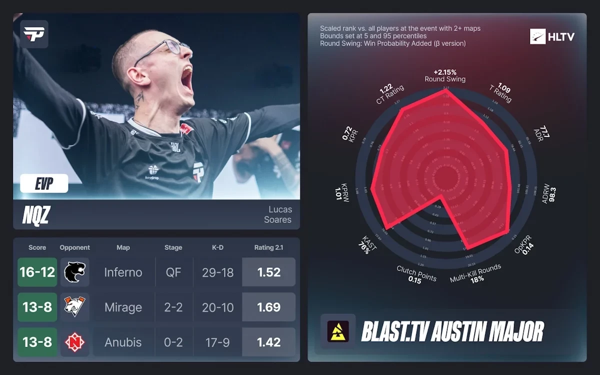 Лукас «nqz» Соарес из Бразилии завершает этот звездный список, заслужив свой EVP благодаря невероятным показателям в победах paiN.