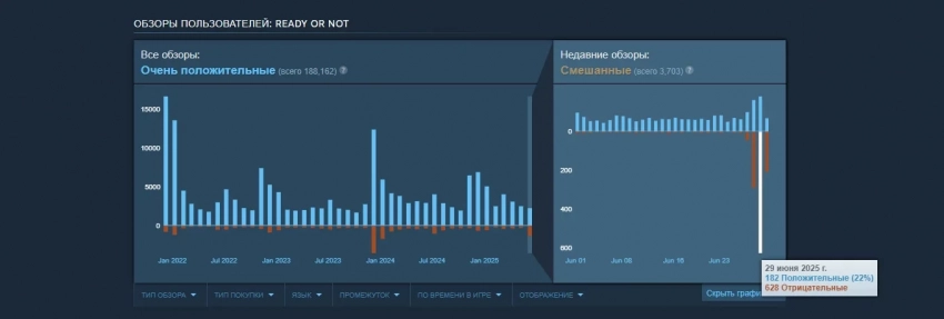 Несмотря на обещания того, что Ready Or Not останется мрачной игрой без серьёзных изменений контента, новости о грядущей цензуре взбесили игроков. Из-за этого недавние оценки шутера в Steam стали «смешанными», но не исключено, что в дальнейшем рейтинг опустится ещё ниже.