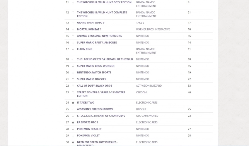 Кроме того, в топ-10 вновь вошла The Legend of Zelda: Tears of the Kingdom. В чарте за позапрошлую неделю она занимала 13 строчку, теперь — 8-ю. А EA Sports F1 25 взлетела с 25-го места сразу на 9-е. Закрывает топ-10 французская JRPG Clair Obscur: Expedition 33.