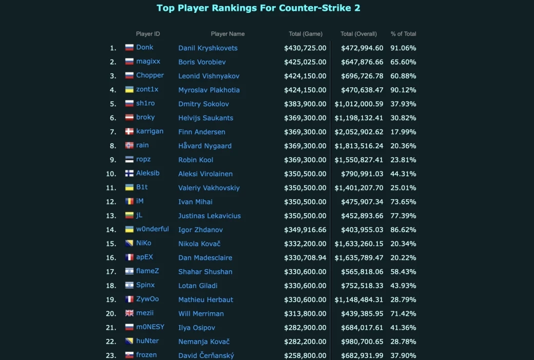 Team Spirit и ее игроки возглавили рейтинги по количеству призовых в Counter-Strike 2