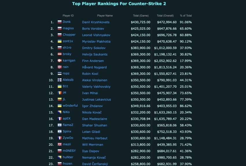 Помимо «драконов» в списке оказались Валерий «B1T» Ваховский и Игорь «w0nderful» Жданов из Natus Vincere, а также Илья «m0NESY» Осипов. «Рожденные побеждать» занимают 11 и 14 места с суммами 350 и 249 тыс долларов соответственно. А «m0NESY» находится на 21 строчке с 282 тыс долларов.