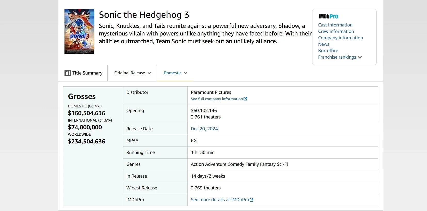 Сборы «Соника 3» превышают 234,5 млн долларов по всему миру.