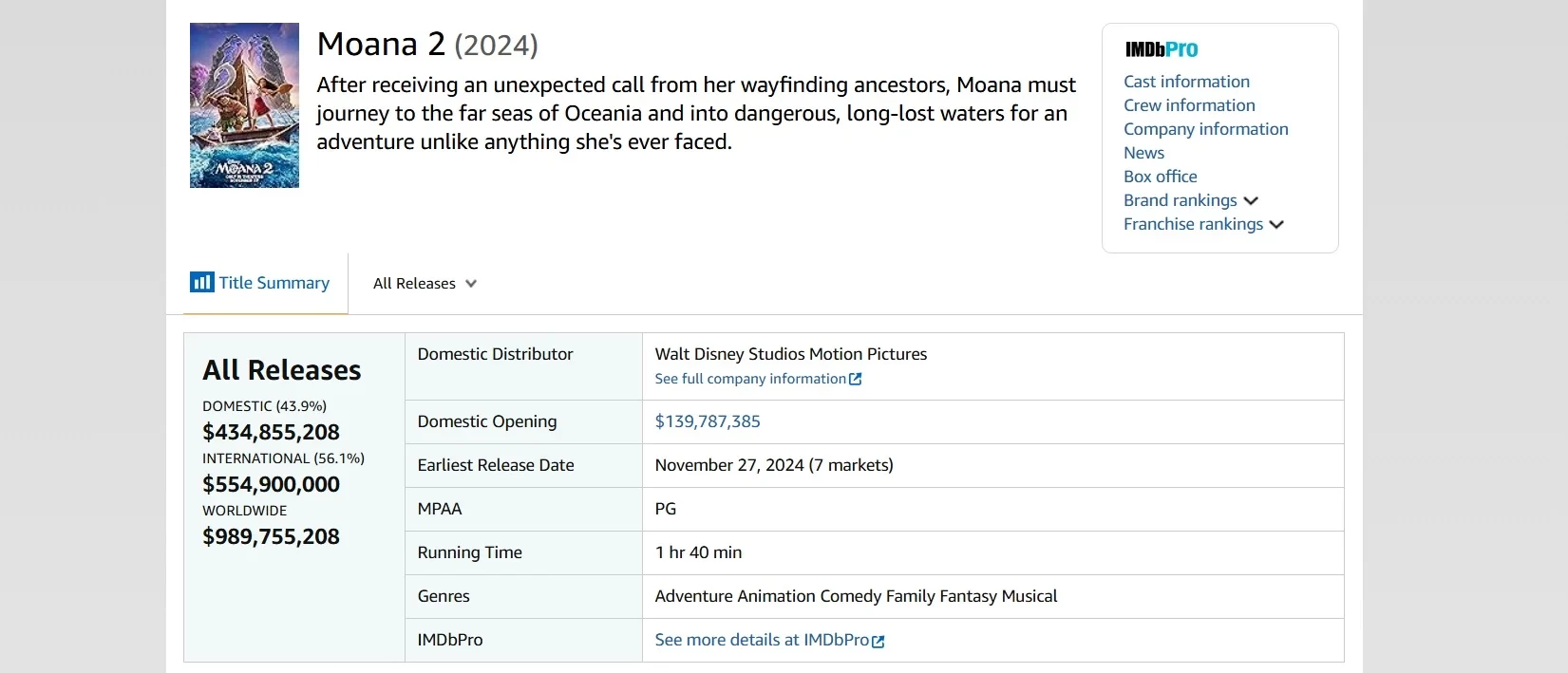 В общем рейтинге фильмов за прошлый год сиквел «Моаны» занимает 3-е место. На первом и втором месте, напомним, находятся «Головоломка 2» с 1,69 млрд долларов и «Дэдпул и Росомаха» с 1,33 млрд долларов соответственно.