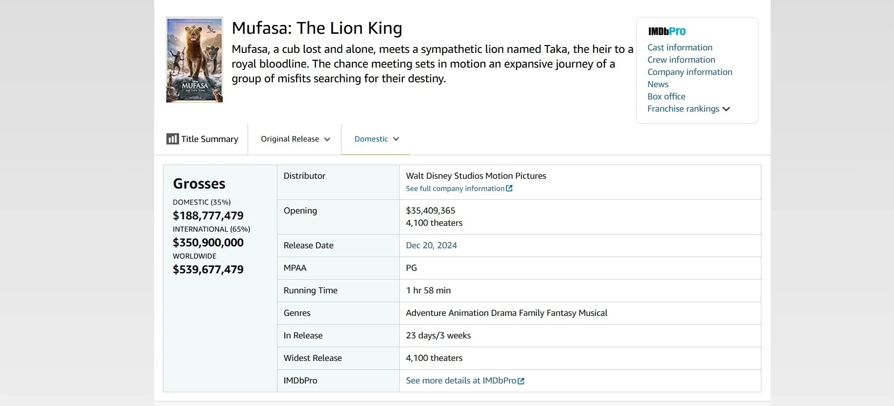 Сборы семейного приключения «Муфаса: Король Лев» достигли 539,6 млн долларов во всём мире. В США он собрал 188,7 млн долларов, а в других странах — 350,9 млн.