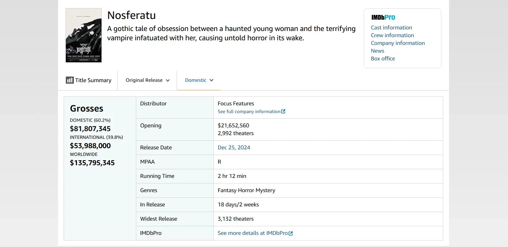 Тем временем «Носферату» Роберта Эггерса собрал в мировом прокате уже 135,7 млн долларов. Фильм стал крупнейший релизом режиссёра за рубежом (53,9 млн долларов).