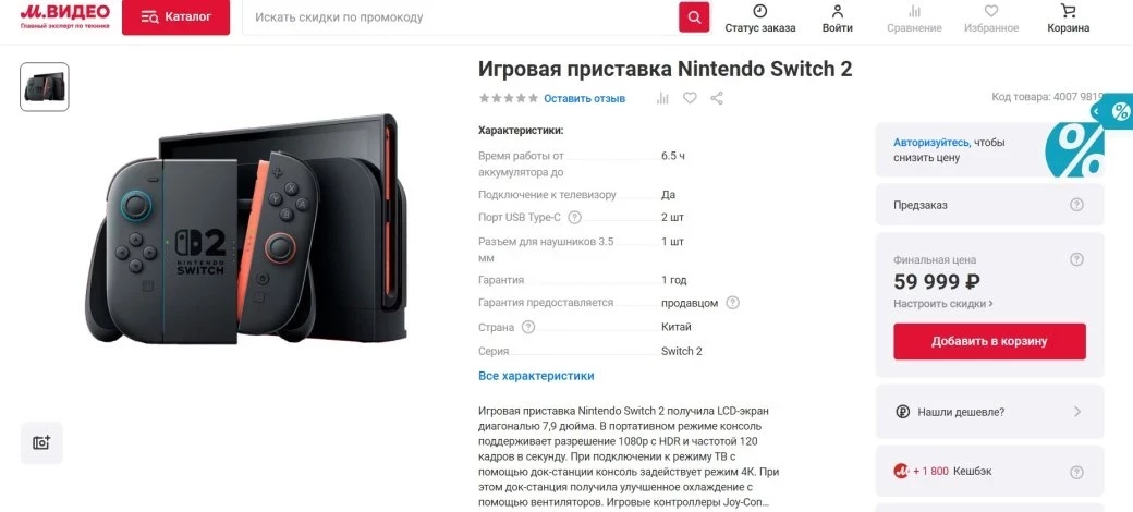 Тем временем в магазине «Видеоигр.Нет» за 60 тыс рублей можно будет приобрести Nintendo Switch 2 в комплекте с кодом загрузки Mario Kart World. Предзаказ просто консоли обойдётся в 55 тыс рублей.