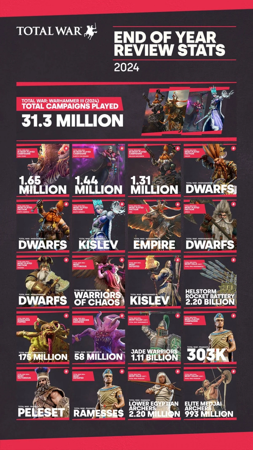 - в Total War: Warhammer III было сыграно 31,3 миллиона кампаний;