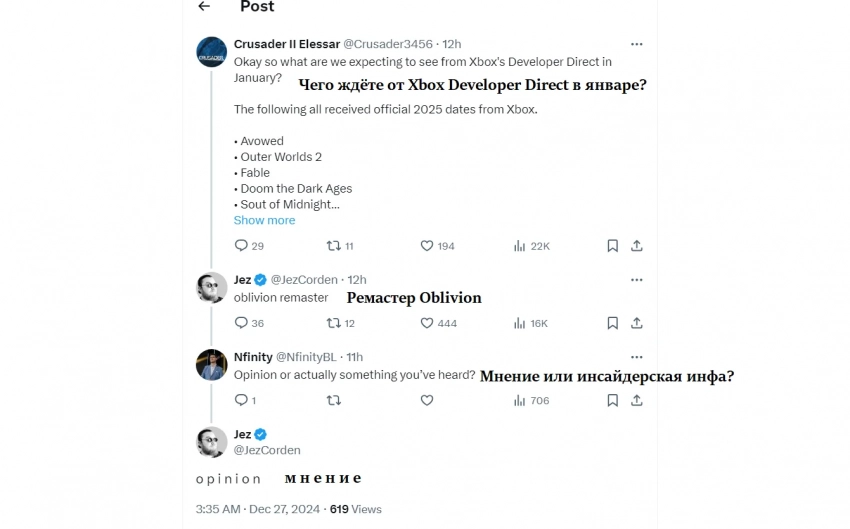 А теперь к «ждунам» присоединился известный инсайдер и редактор Windows Central Джез Корден. Он тоже ожидает от январской Developer Direct анонса обновлённой версии «Обливиона», причём конкретно ремастера. Правда, неясно — владеет ли Корден какой-то инсайдерской информацией, или он сам поверил в сторонние слухи.