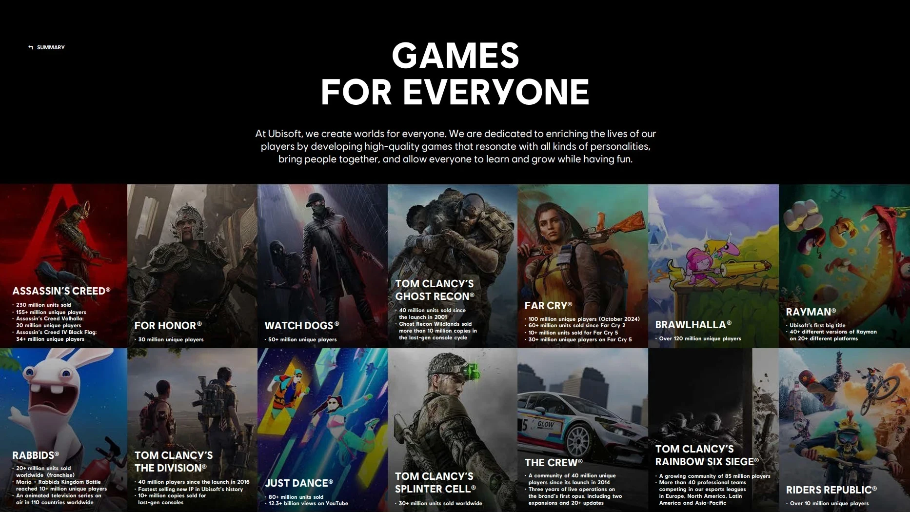 - серия Rabbids — свыше 20 миллионов проданных копий, а также более 10 миллионов уникальных игроков Mario + Rabbids Kingdom Battle.