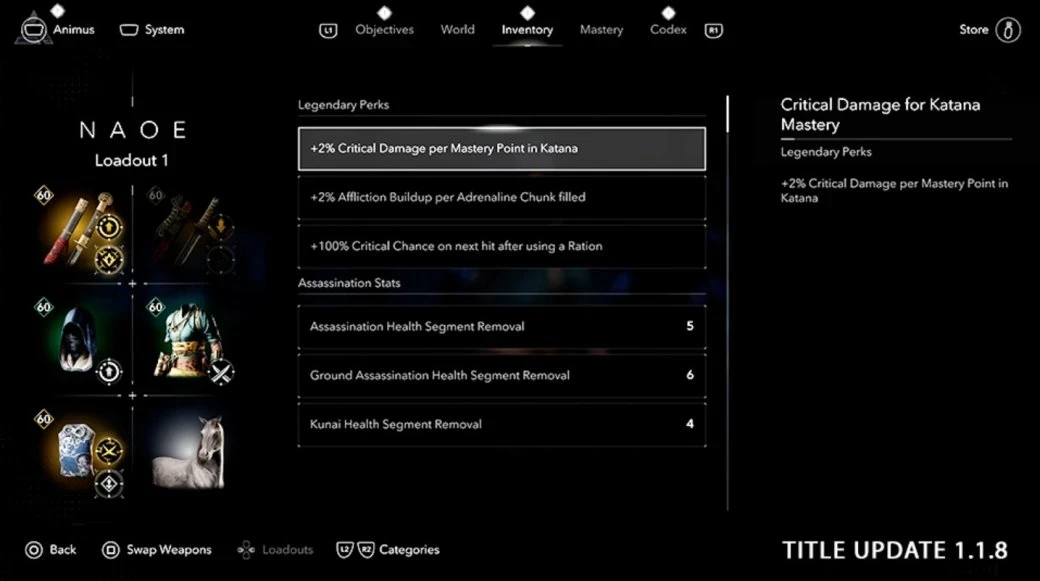 Но новая опция оказалась не единственной новинкой обновления 1.1.8. В инвентаре появилась возможность открыть подробную статистику снаряжения и перков — это поможет в настройке своей уникальной сборки. А ещё Ubisoft добавила новую точку входа в «Анимус» возле убежища и улучшила информативность полоски здоровья врагов при нанесении критических ударов.