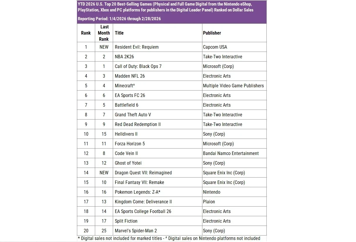 Это явление наблюдается на PC, PlayStation и Xbox. Исключение составляет Nintendo Switch. Там новинка заняла четвёртое место за февраль, причём в составе Generation pack для Switch 2. Туда входят Resident Evil 7 Gold Edition, Resident Evil Village Gold Edition и Resident Evil Requiem. Топ-3 заняли Mario Tennis Fever, Dragon Quest VII: Reimagined и Pokemon Legends: Z-A.