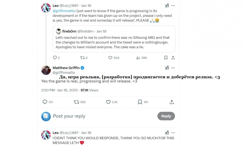 Гриффин подтвердил, что Silksong всё ещё жива, над ней всё ещё ведётся работа, и команда не забросила проект.