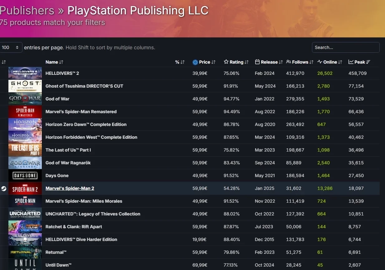 Пиковый онлайн Marvelʼs Spider-Man 2 достиг 18 097 игроков одновременно. Возможно, ещё не вечер, но сейчас этот результат хуже: