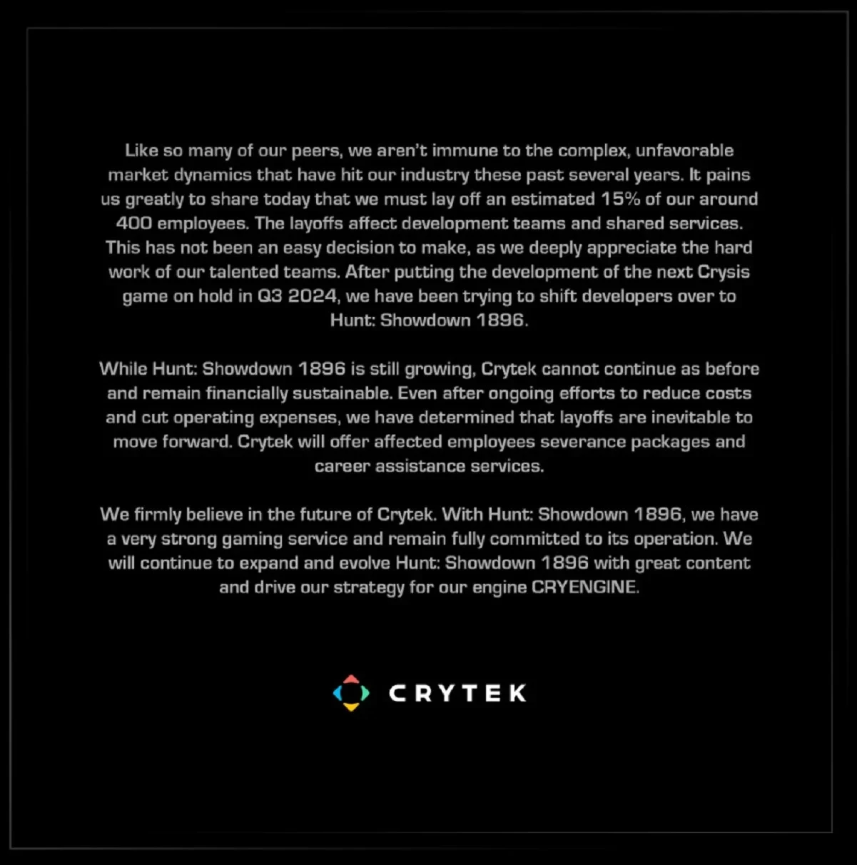 Увы, вместе с известиями об увольнениях стал известен ещё один неприятный факт — разработка Crysis 4 была приостановлена. Это произошло ещё в четвёртом квартале 2024 года. В Crytek хотят сфокусироваться на своём другом шутере — Hunt: Showdown 1896. Он «всё ещё растёт» и позволяет разработчикам верить в светлое будущее.