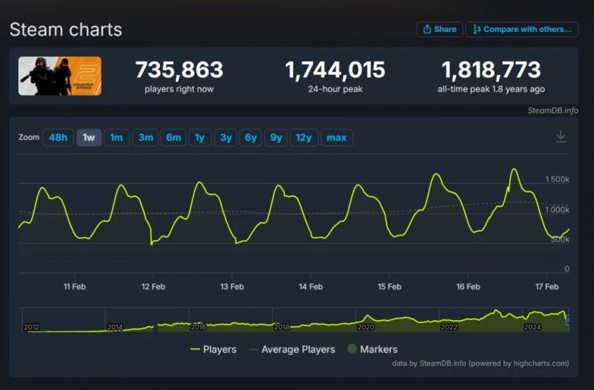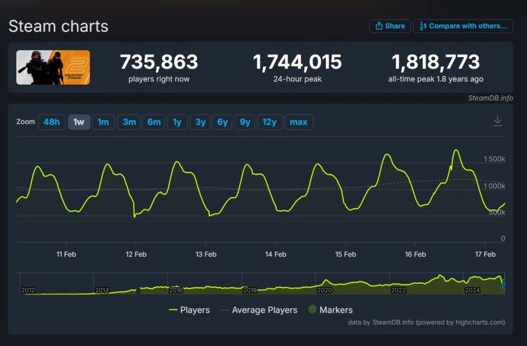 Counter-Strike 2 привлекла почти 1,75 млн игроков одновременно в Steam